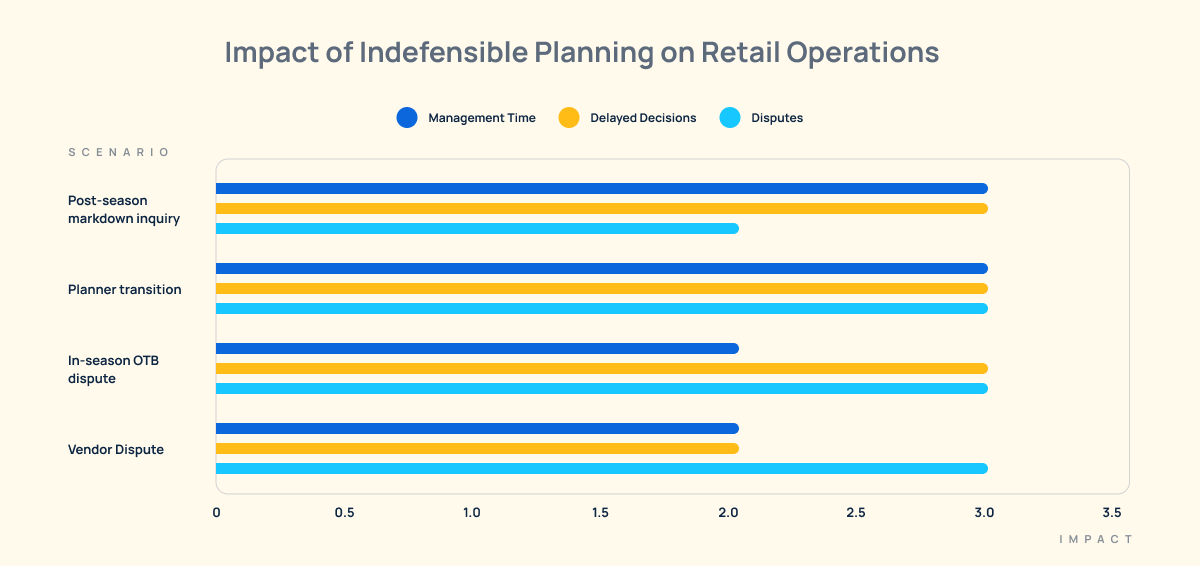 A category comes in 30% under plan. Inventory sits, markdowns follow. Without documented planning records, your answer is reconstructed from memory and email threads. It does not prevent the same outcome next season.