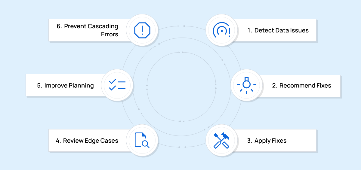 At scale, manual vigilance doesn’t work. The only sustainable model is continuous detection, recommended fixes, and automated corrections before bad data reaches forecasts, budgets, or allocations.